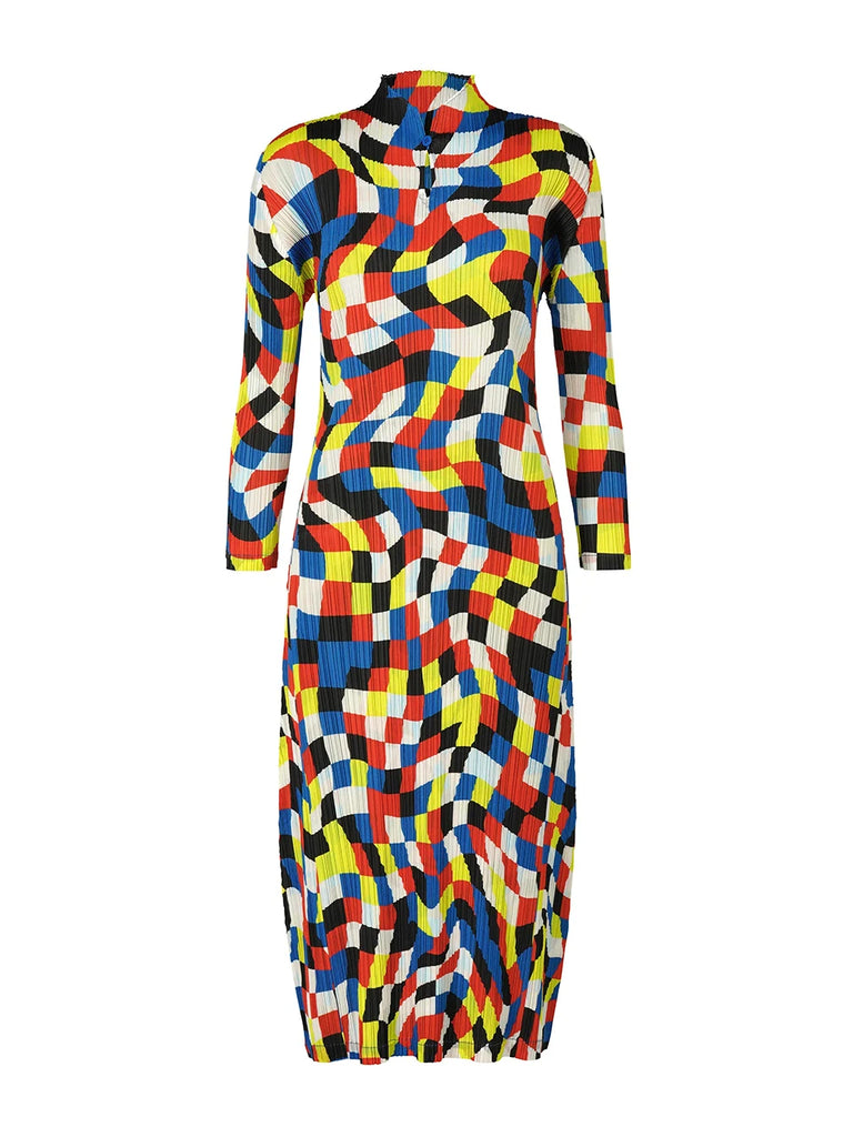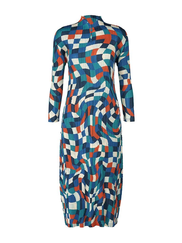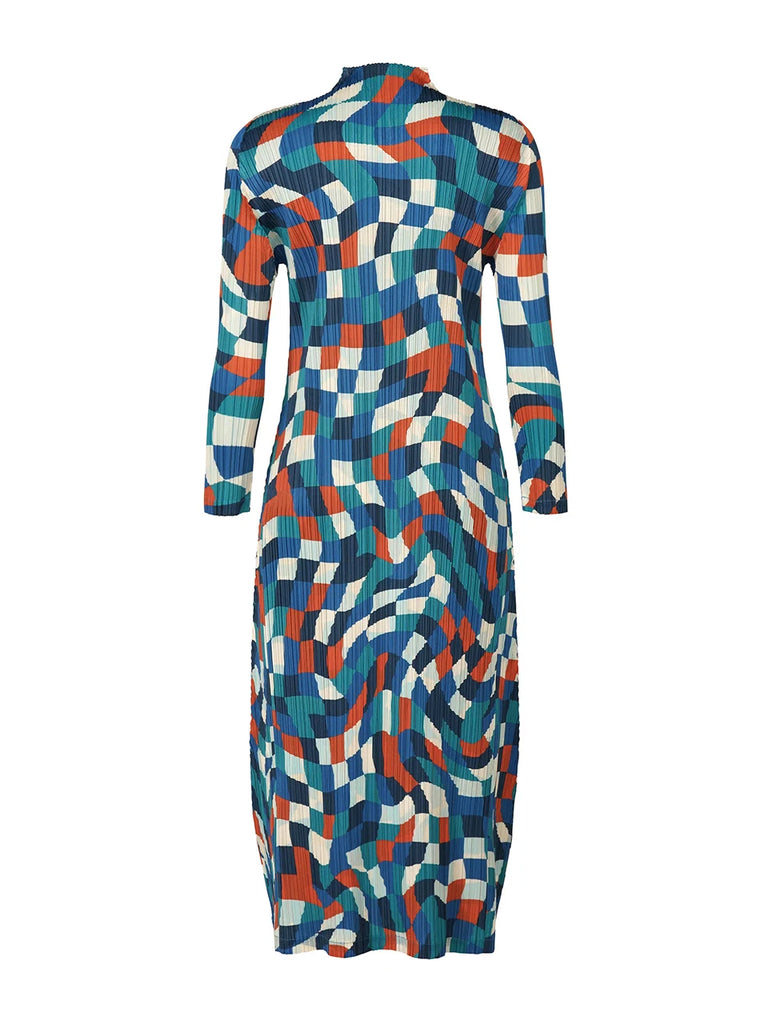 The CurveKind™ Dancing Squares High-Neck Maxi Dress is a statement of fluid structure and modern elegance. Crafted from softly pleated knit fabric with gentle stretch, it moves gracefully with the body while maintaining a refined silhouette. Featuring a high neckline, full-length sleeves, and a flowing ankle-length design, this pullover dress is finished with sculptural folds and a dynamic plaid pattern that adds visual rhythm and depth. Designed for movement, confidence, and intentional luxury, it’s an elevated piece made to stand out effortlessly.