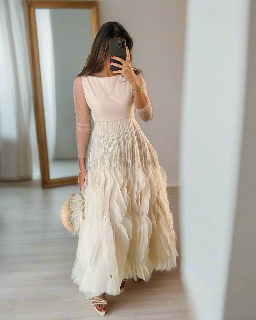 Gracefully crafted for those who seek elegance, this intricate scoop neck midi dress combines timeless charm with a modern flair. Its A-line silhouette and ankle-length hem offer a flattering, flowing shape that feels refined yet relaxed, perfect for proms, formal events, or styled pastoral outings.