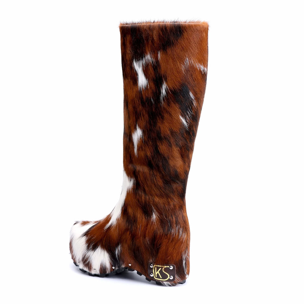 Handmade Studded Knee-High Platform Boots with Real Calf Hair