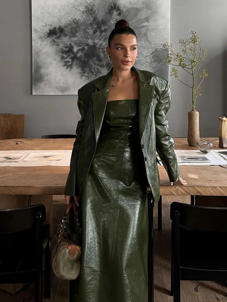 Upgrade your wardrobe with our Faux Leather Strapless Two Pieces Set. Designed with a lapel jacket and slim bodice fit, this A-line dress is perfect for any occasion. Show off your style with its sleeveless and long silhouette, made with high-quality faux leather.