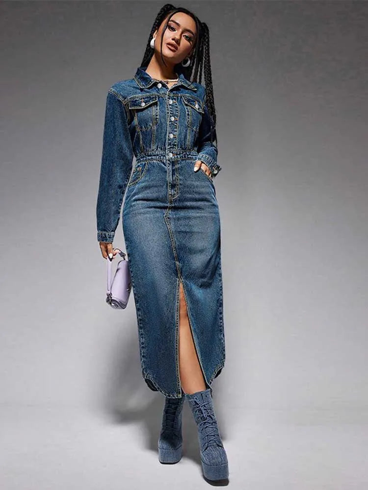 Step into timeless style with this Turn-Down Collar Denim Maxi Dress, designed for effortless sophistication. Featuring full-length sleeves and a flattering ankle-length cut, this dress blends structure with casual ease. Perfect for creating women's fall outfit 2025 looks, autumn outfit dress inspiration, or day-to-night outfit ideas, it's a must-have for seasonal transitions. Pair with boots, heels, or pastel color outfits for added charm. Whether you're dressing for brunch or looking for outfits for beach pictures with a twist, this denim dress delivers every time.