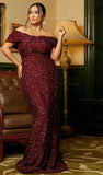 Step into the spotlight with our Elegant Off Shoulder Short Sleeve Sequins Dress. This glamorous gown features a strapless off-shoulder neckline, delicate short sleeves, and shimmering sequin embellishments that catch the light beautifully. Designed in a mermaid/trumpet silhouette, it hugs your curves and flares gracefully at the hem for a dramatic finish. Perfect for weddings, formal parties, red carpet events, and special occasions, this dress ensures you radiate confidence and sophistication all night long.