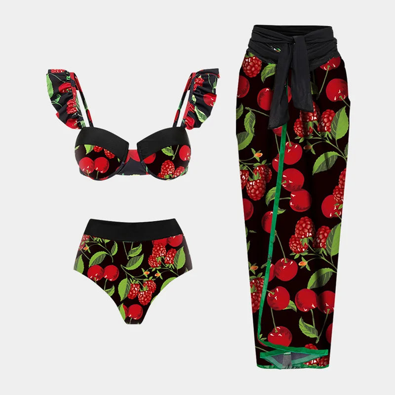 Ruffle Floral Printed Swimwear And Skirt Suit