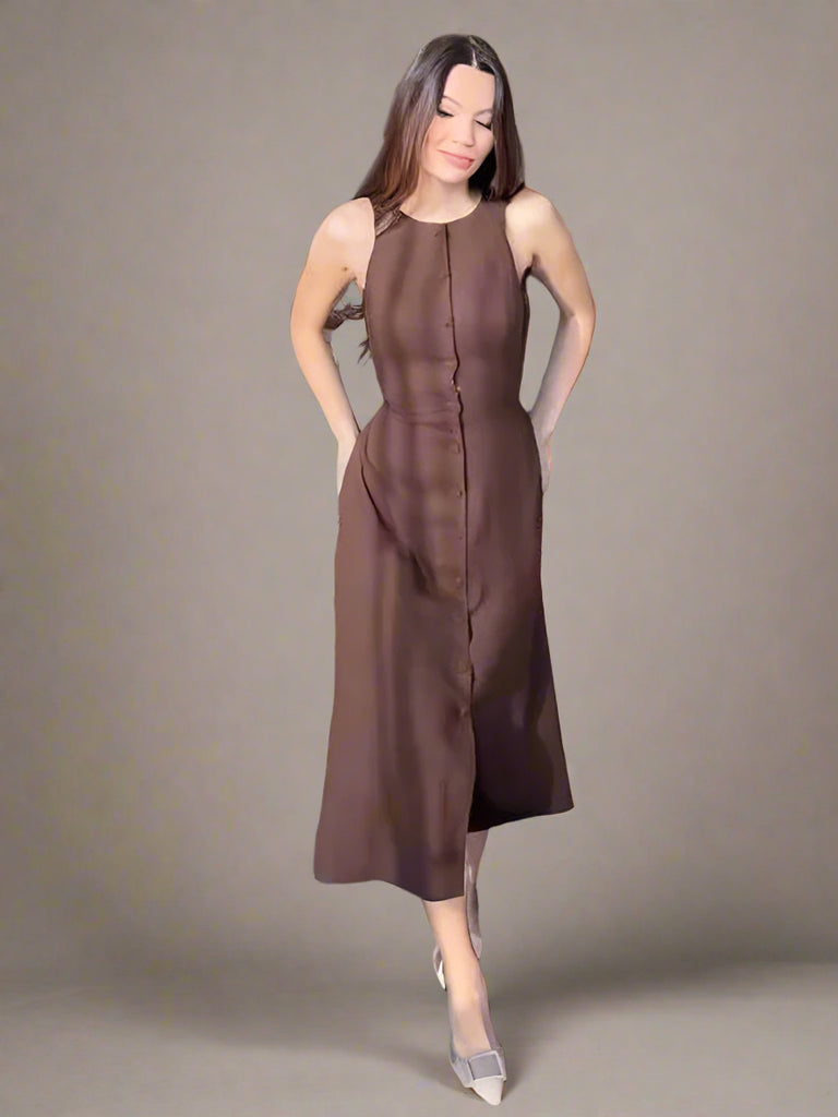 Step into effortless charm with this elegant sleeveless long dress for women, featuring a classic O-neckline, single-breasted button closure, and flattering A-line silhouette. Crafted from breathable polyester fabric, this solid color summer dress 2025 is perfect for daytime outings, casual strolls, or office-ready chic. With its mid-calf length and slight stretch, it offers a relaxed yet polished fit for any modern woman’s wardrobe.